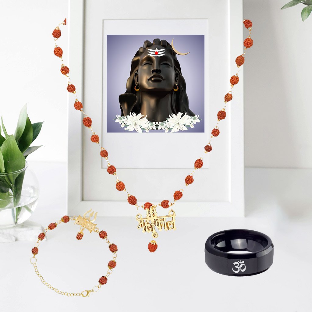 Men's Gold-Plated Rudraksh Mahakal Pendant Necklace & Rudraksh Bracelet Black Ring Combo Set