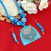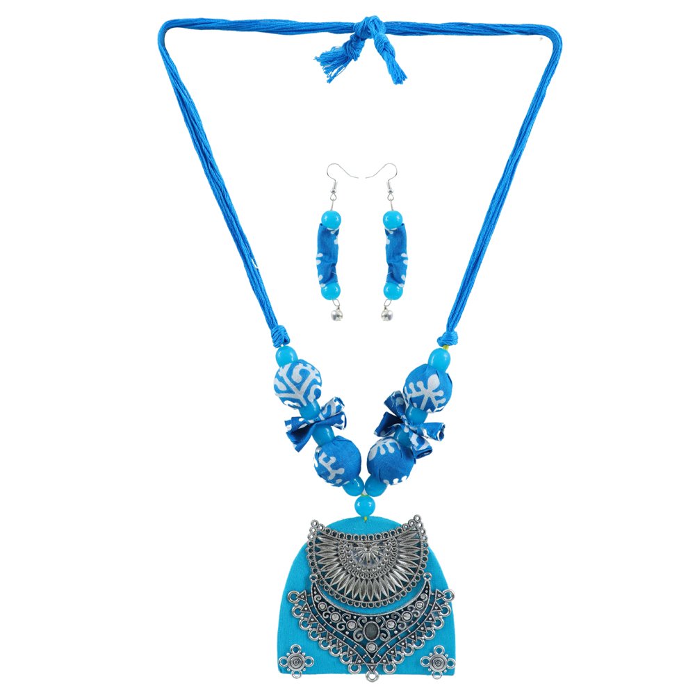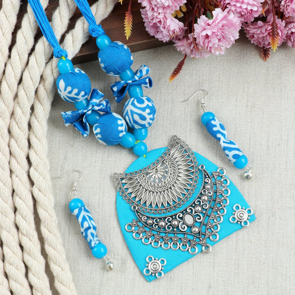 Blossoms Handmade Blue Fabric Oxidised Silver Pendant Jewellery Set