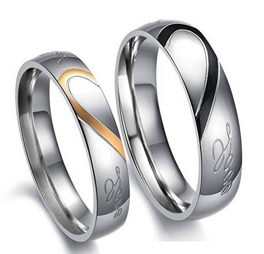 His and Hers Black/Gold Silver-Plated Half Heart Couple Ring