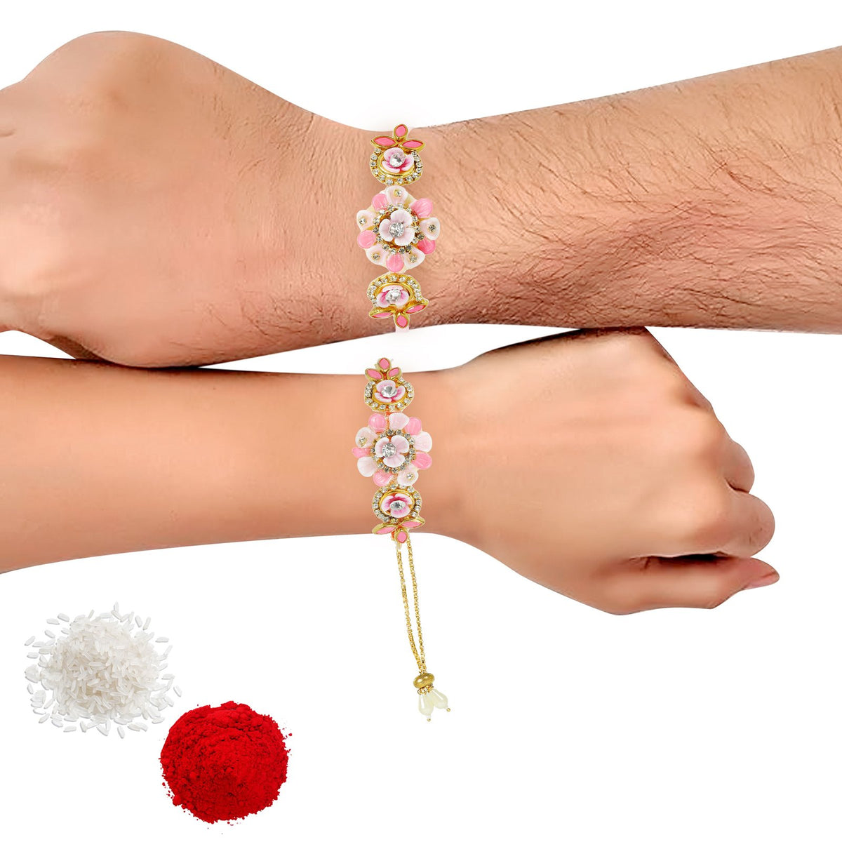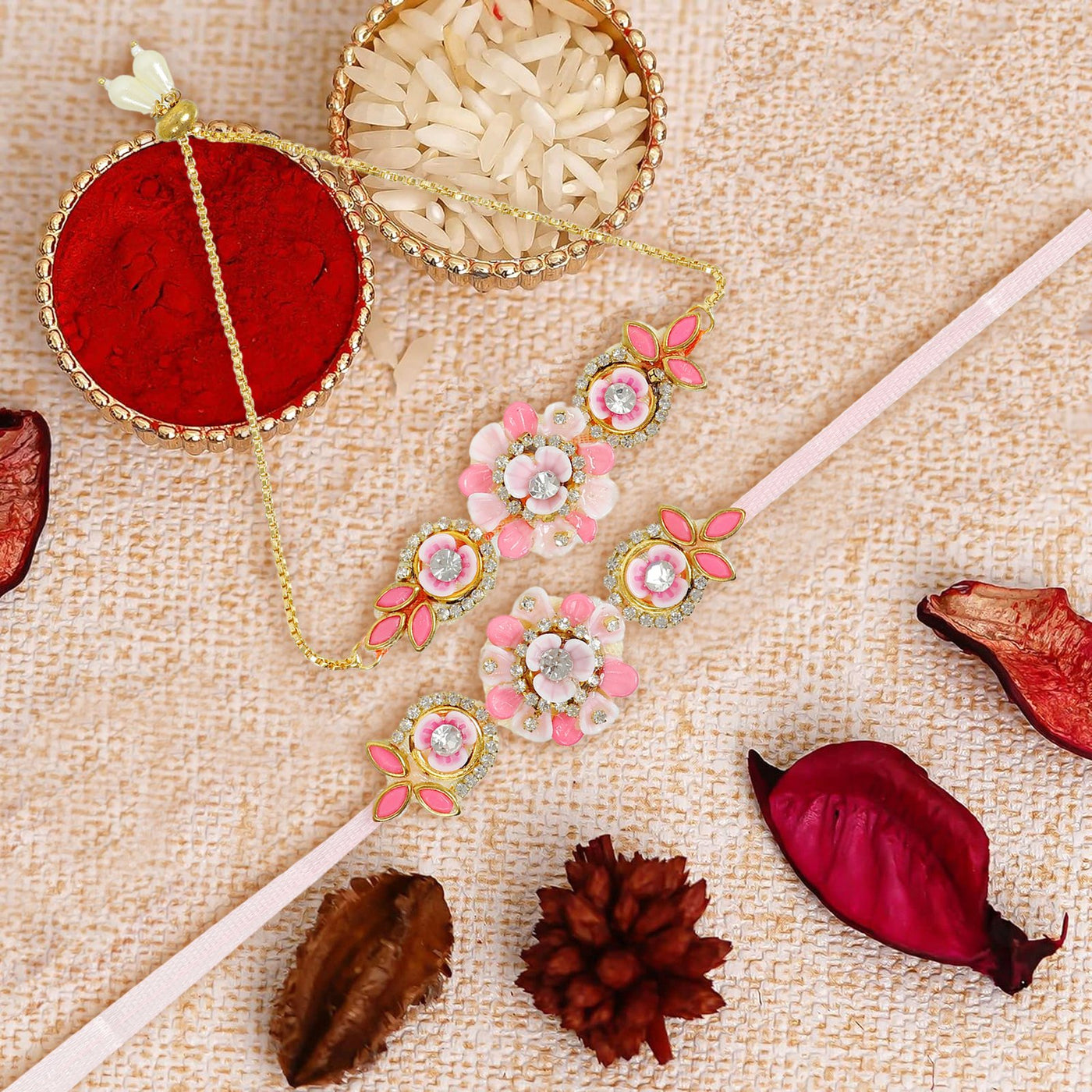 Pink Floral Kundan Zari Design Bhaiya Bhabhi Rakhi Set