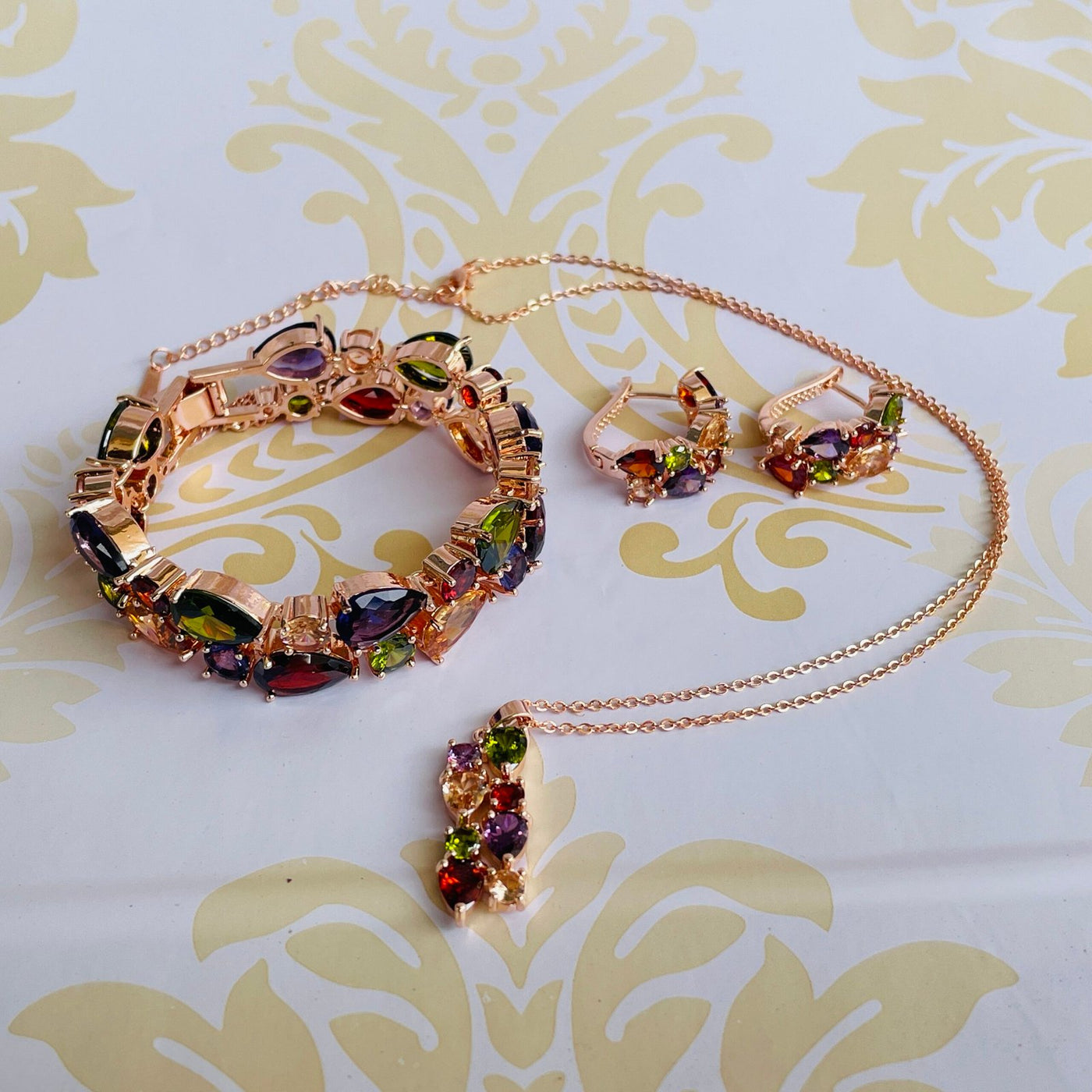 Gold-Plated Combo of Multicolor Crystal-Stud Pendant Set with Bracelet for Women/Girl